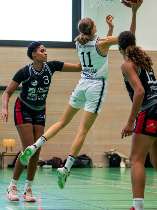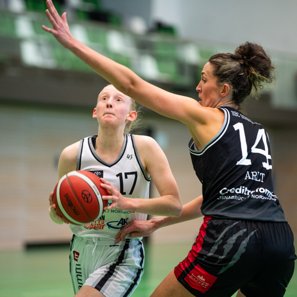 Es war über weite Strecken ein starker Auftritt der Zweitligadamen des BBC gegen den Erstligisten TK Hannover Luchse, doch am Ende behielten die klassenhöheren Hannoveranerinnen mit 14 Punkten die Oberhand! Mit nur 8 Spielerinnen konnten die Gastgeberinnen antreten, da sich neben den Rekonvaleszenten Julia Herrschaft, Kira Dölle und Tessa Strompen nun auch noch Ann-Sophie Ossowski krankheitsbedingt kurz vor dem Spiel abmelden musste. Besonders hart trifft den BBC der inzwischen feststehende langfristige Ausfall ihrer Teamkapitänin und Topscorerin Maya Girmann, deren Knieprobleme sich als schwerwiegender herausgestellt haben als erhofft. Alle im Verein und im Umfeld des BBC wünschen der sympathischen Centerin alles Gute und drücken fest die Daumen, dass sie in absehbarer Zukunft wieder auf dem Basketballfeld stehen wird!